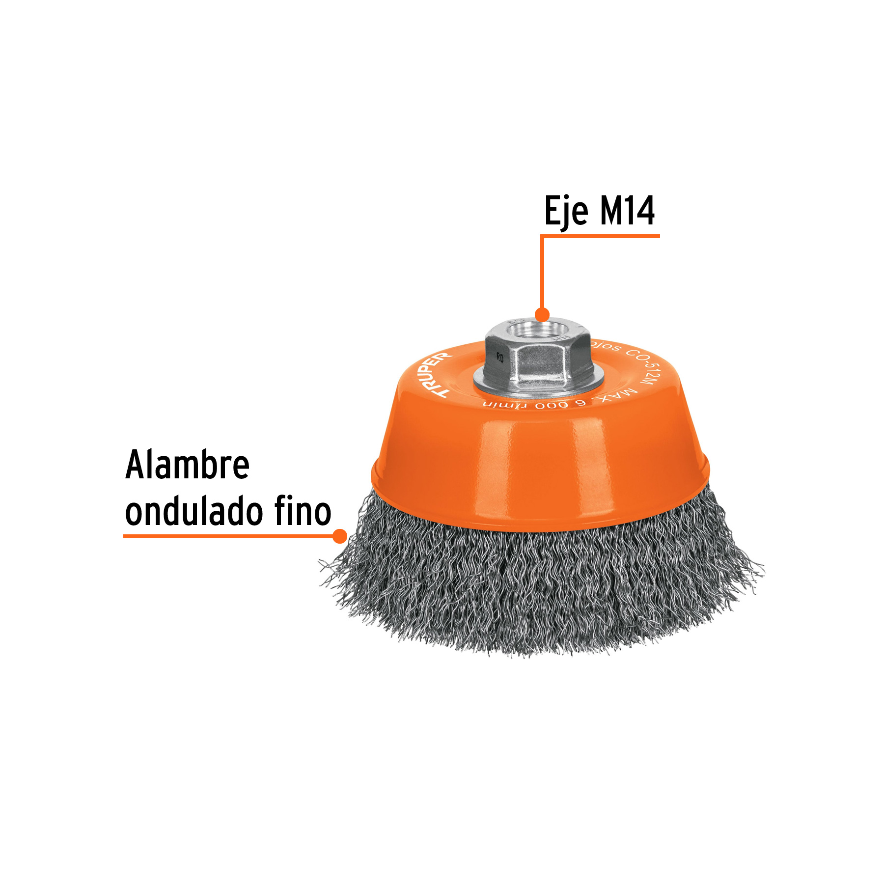 Especificación: Carda copa 5′ alambre ondulado fino, eje M14, Truper