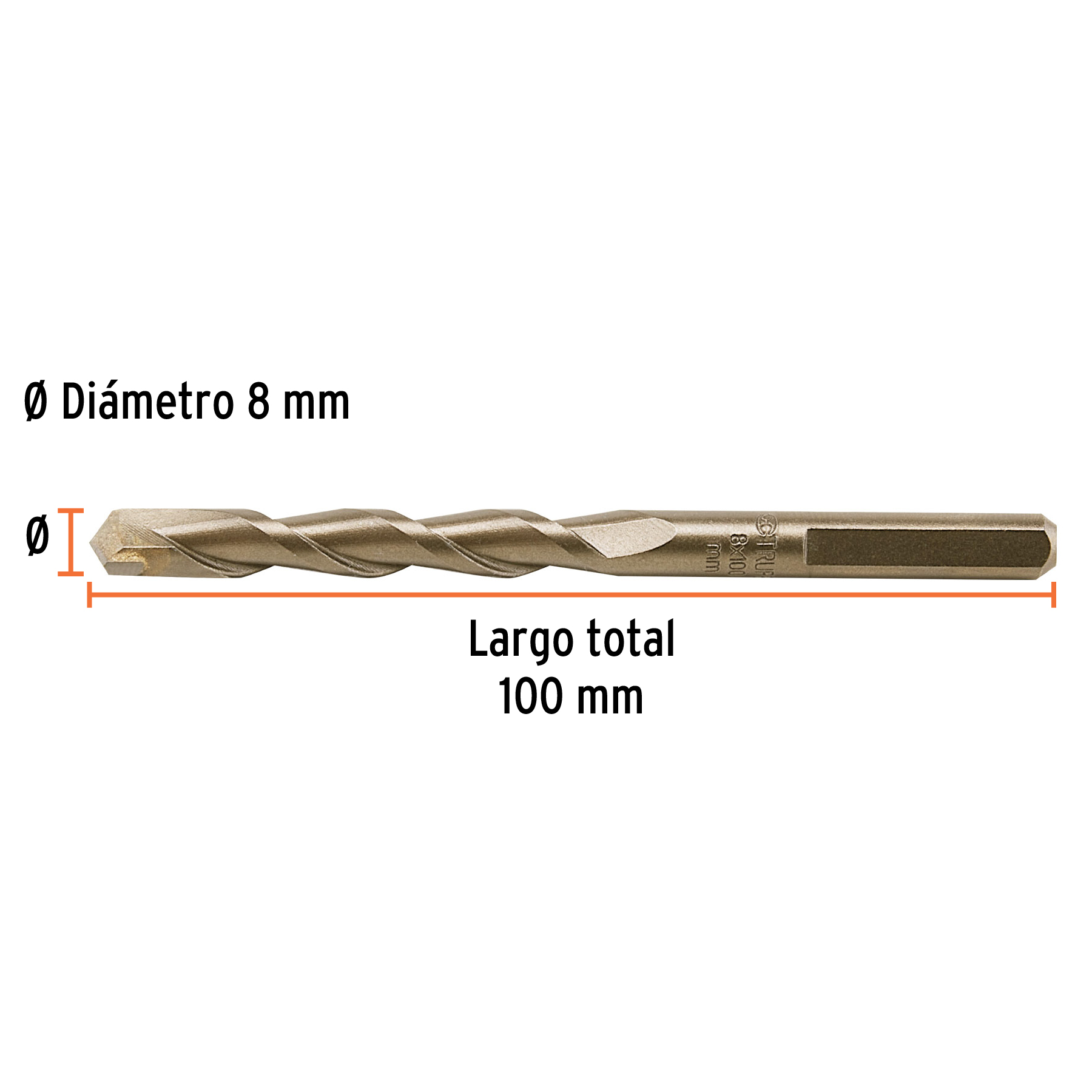 Broca para concreto Truper 8 x 100 mm: Perfecta para perforaciones precisas y duraderas en materiales de construcción como concreto, ladrillo y bloque. Fabricada con acero al cromo de alta resistencia y punta de carburo de tungsteno para máxima durabilidad y rendimiento. ¡Ideal para trabajos de albañilería, remodelación y más!