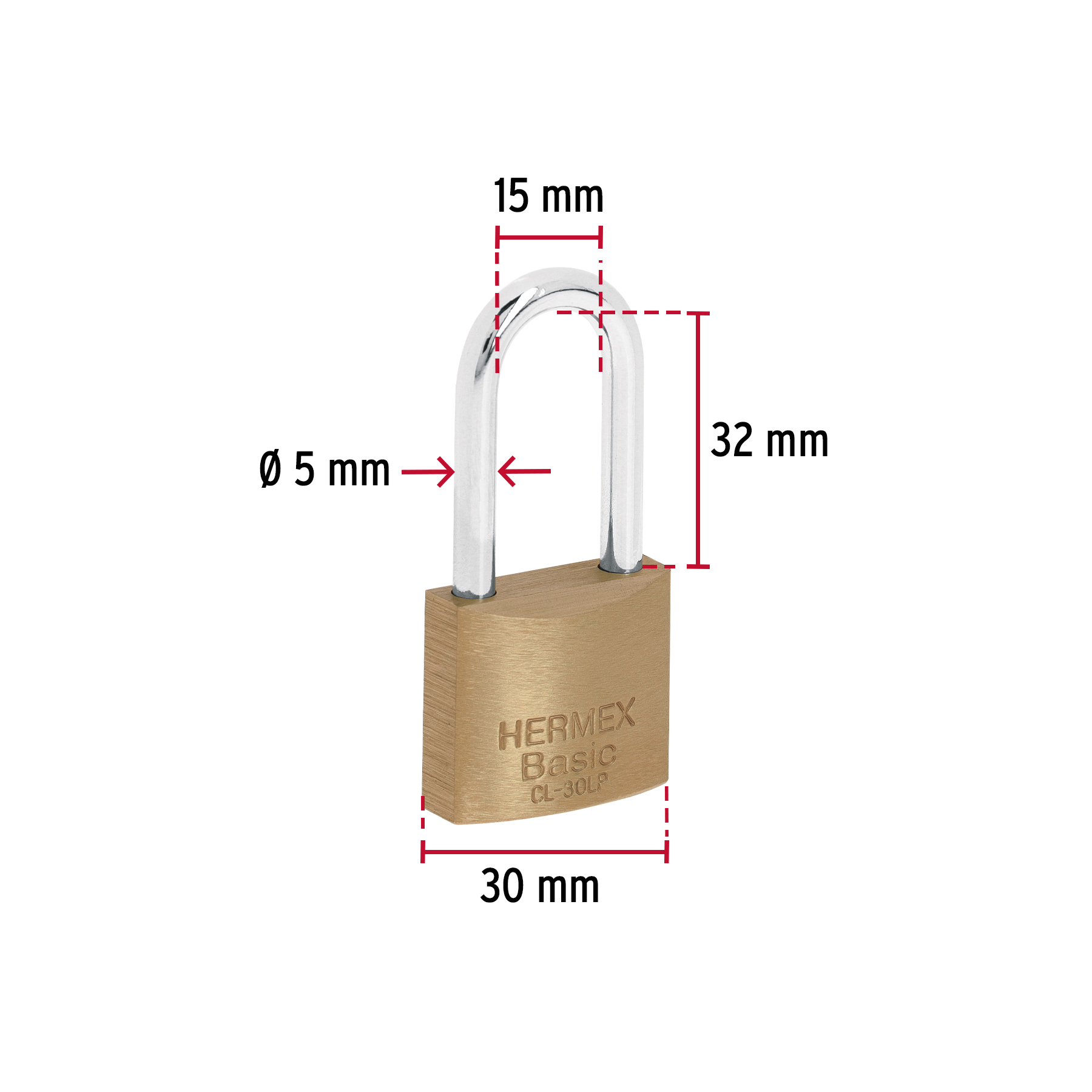 1. Candado de latón 30 mm gancho largo en blíster, Hermex Basic