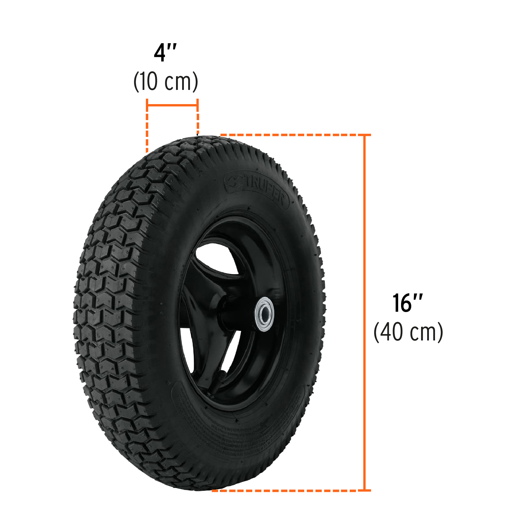 Llanta neumática reforzada con rin de 3 aspas, concha plástica de 3.9 mm y bastidor tubular con grips antiderrapantes. Soportes de uso pesado y tacón estabilizador para mayor estabilidad.