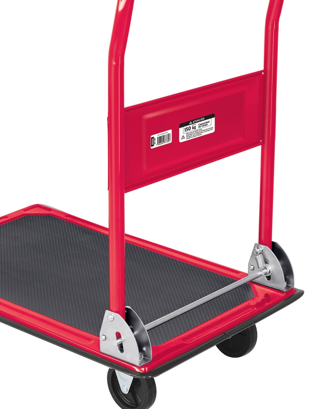 Plataforma en lámina de acero con recubrimiento antiderrapante de PVC, Mango tubular de acero de 1″ (25 mm), Borde forrado de hule que protege de golpes, Plegable para fácil almacenamiento, Rodajas traseras giratorias