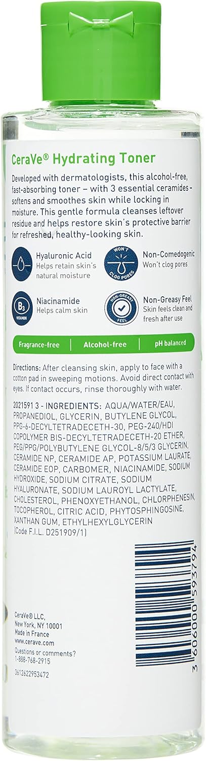 Especificación: CeraVe Hydrating Toner for Face Non-Alcoholic with Hyaluronic Acid, Niacinamide, and Ceramides for Sensitive Dry Skin