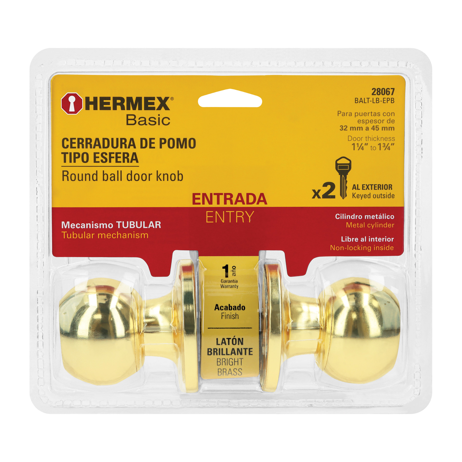 Cerrojo con botón de emergencia al exterior y botón de seguridad al interior, Mecanismo cilíndrico con cilindro metálico, Perilla y escudo de acero, acabado laton brillante, Para colocación en puertas con espesor de 1-1/4″ a 1-3/4″ (32 a 45 mm)