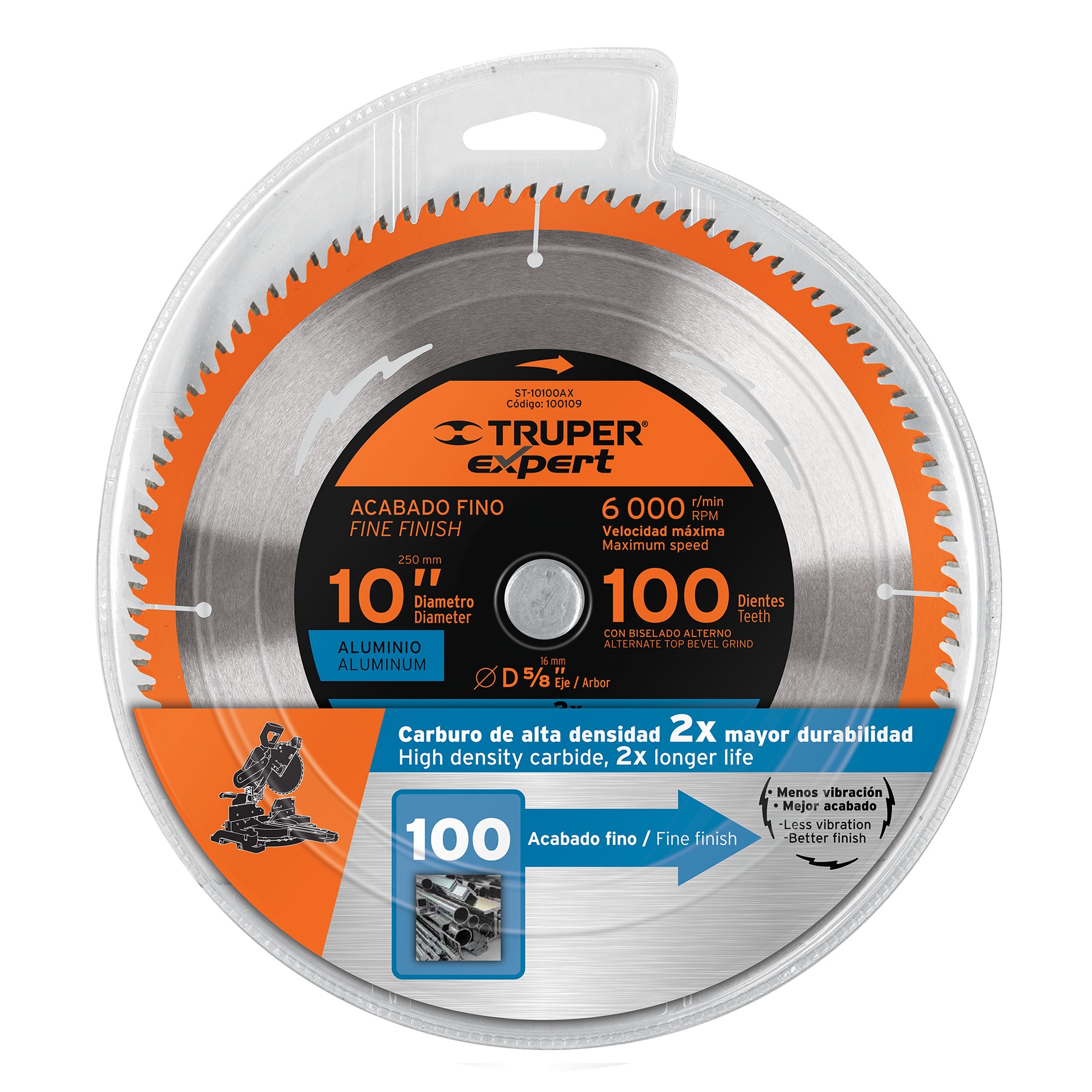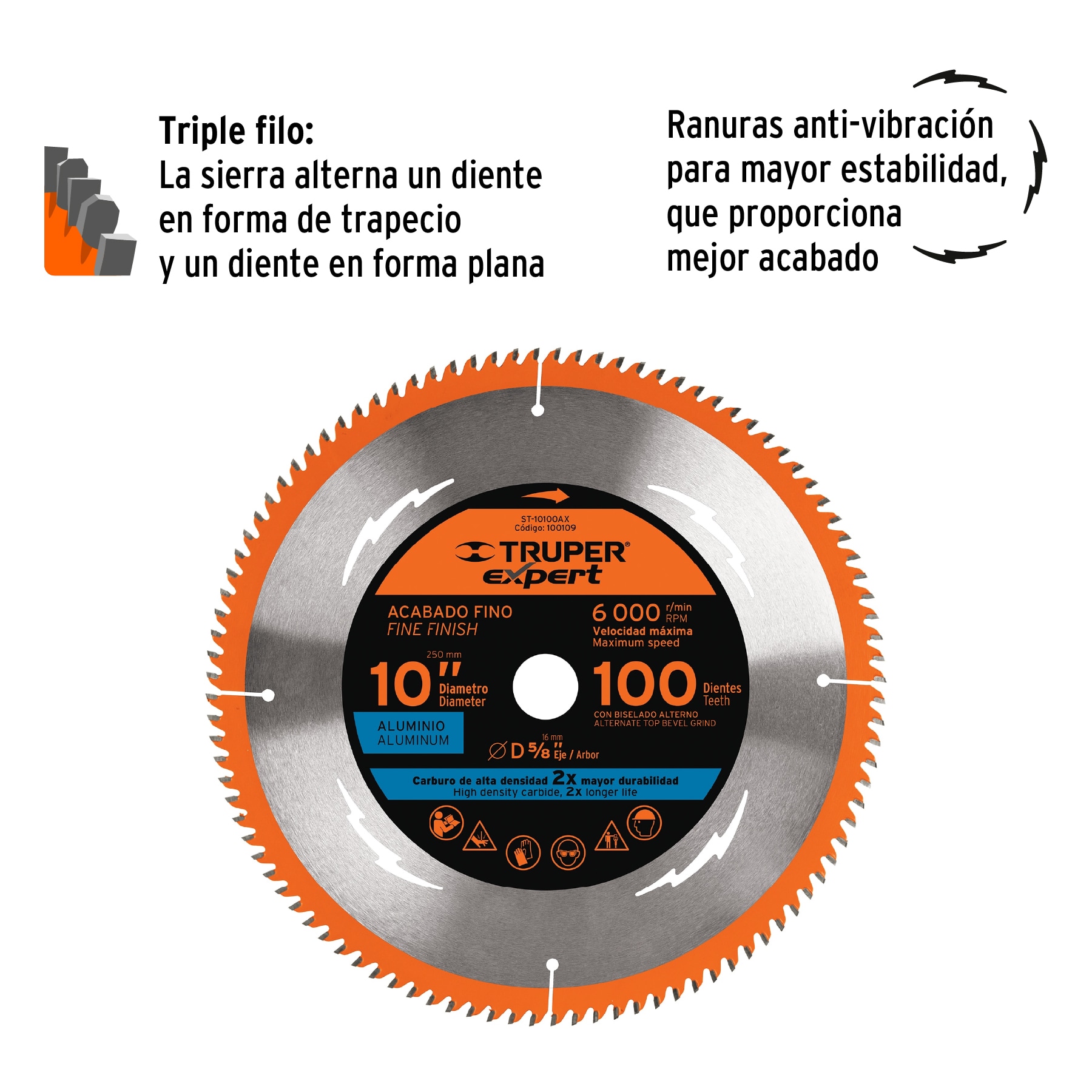 Sierra de uso general con dientes de carburo de alta densidad y diseno anti retroceso Ofrece Doble mayor durabilidad que los discos Truper Incorpora ranuras anti vibracion para una mayor estabilidad y un acabado mejorado El biselado alterno ATB Alternate Top Bevel asegura un rendimiento optimo con dientes alternados hacia la derecha y la izquierda. La soldadura de alta frecuencia proporciona un 50 (Porcetaje) más de resistencia al desprendimiento.