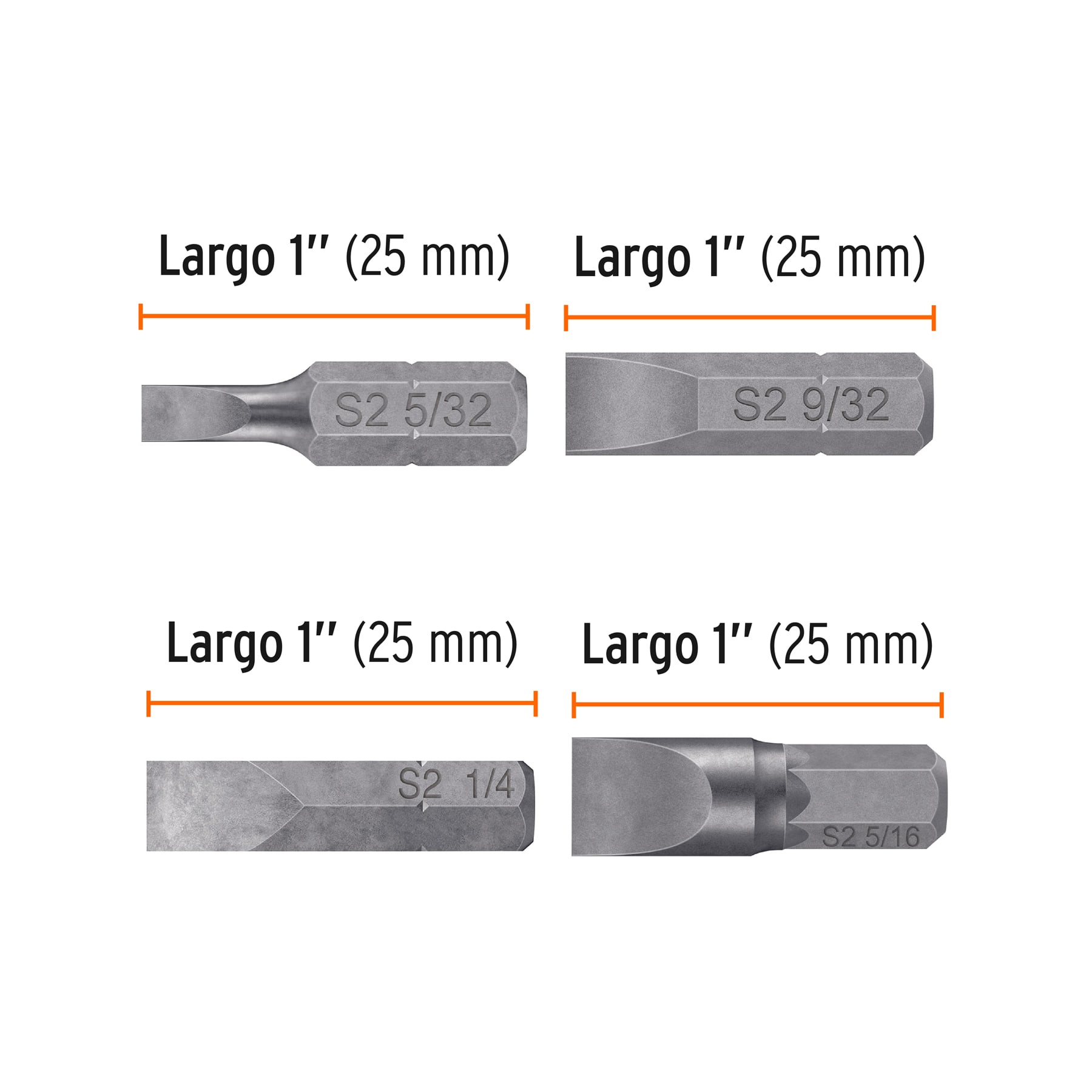 Herramientas de acero S2, con doble resistencia al desgaste frente al acero al cromo vanadio. Maquinado para ajuste preciso, ideales para taladros y desarmadores eléctricos o manuales. Incluye estuche reutilizable.