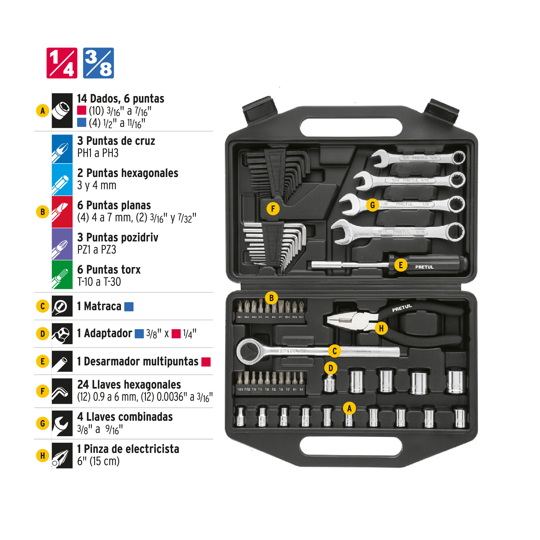 Especificación: Juego de 66 herramientas 1/4′ y 3/8′ para mecánico, Pretul