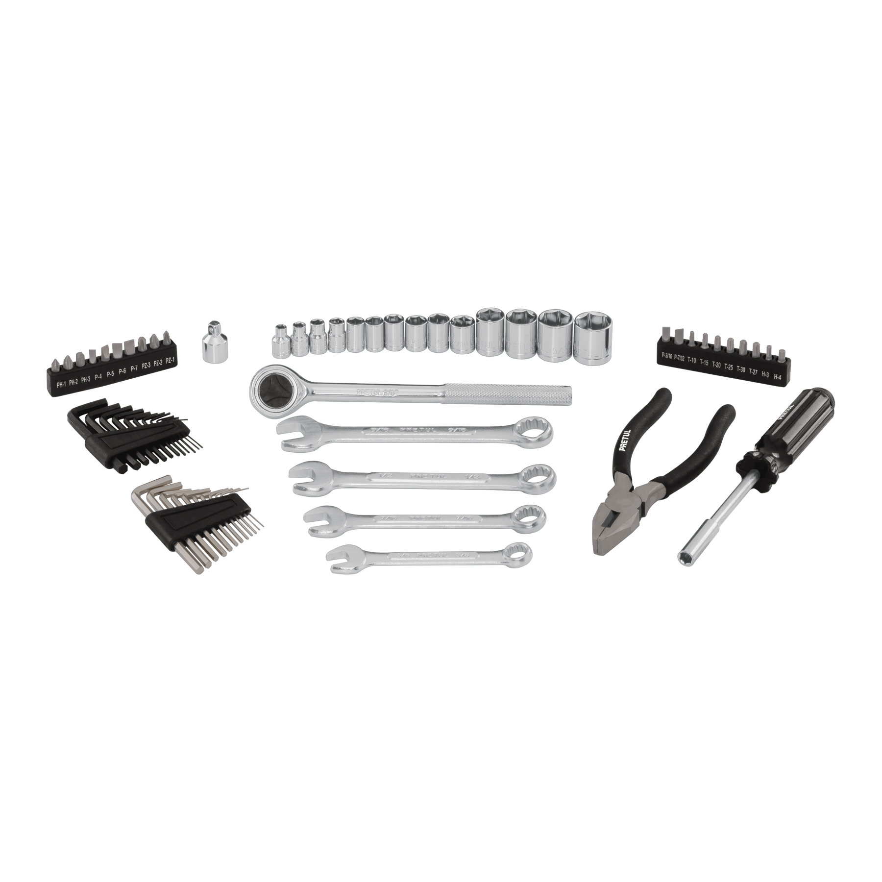 Juego de 66 herramientas Pretul, con medidas de 1/4″ y 3/8″, ideal para tareas mecánicas.