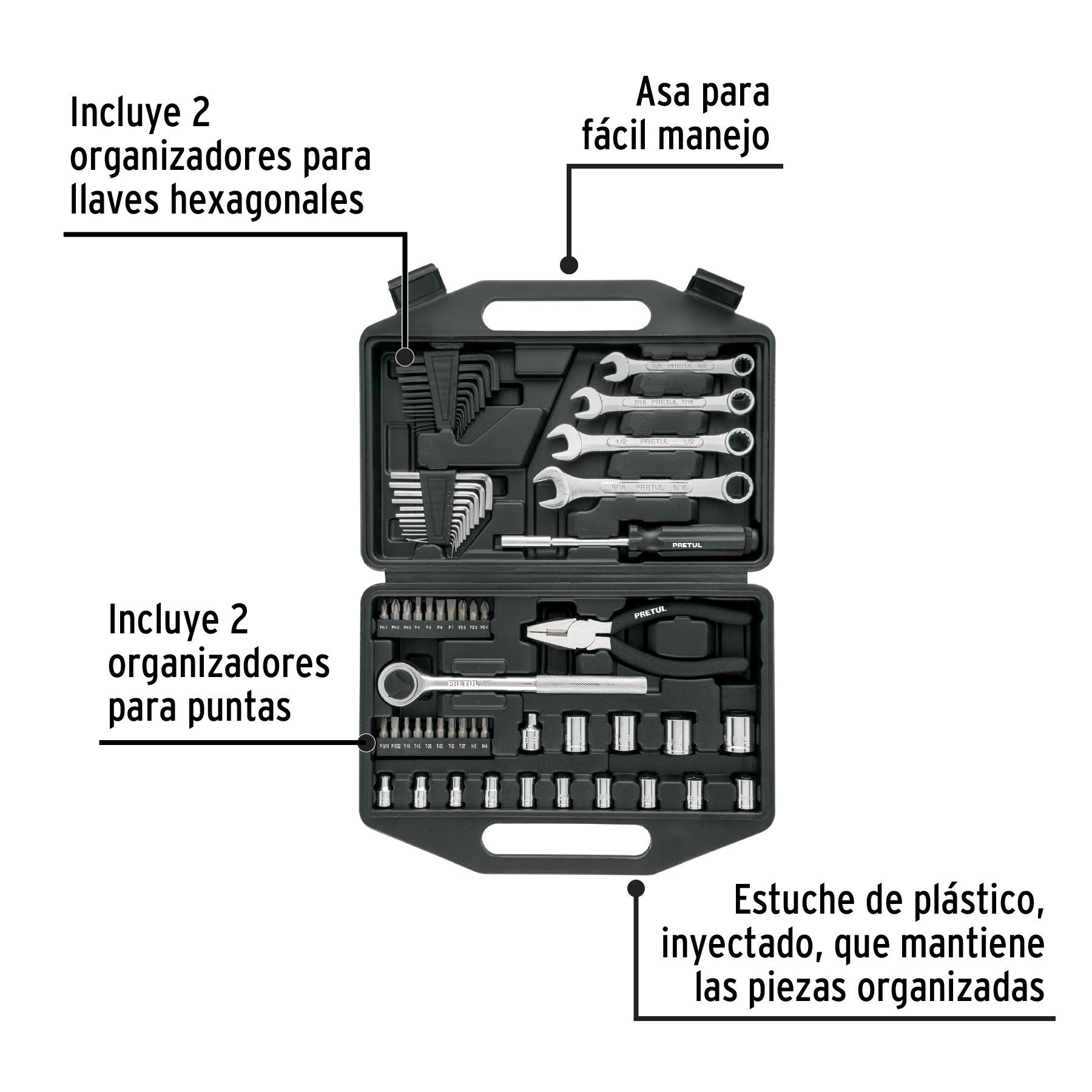 El juego de 66 herramientas Pretul es perfecto para mecánicos que necesitan herramientas confiables y prácticas. Incluye llaves, dados y accesorios en medidas de 1/4″ y 3/8″, fabricados con materiales resistentes para trabajos precisos y duraderos. Su diseño compacto y organizado permite un fácil almacenamiento y transporte, haciéndolo ideal para reparaciones automotrices y trabajos generales de mecánica.