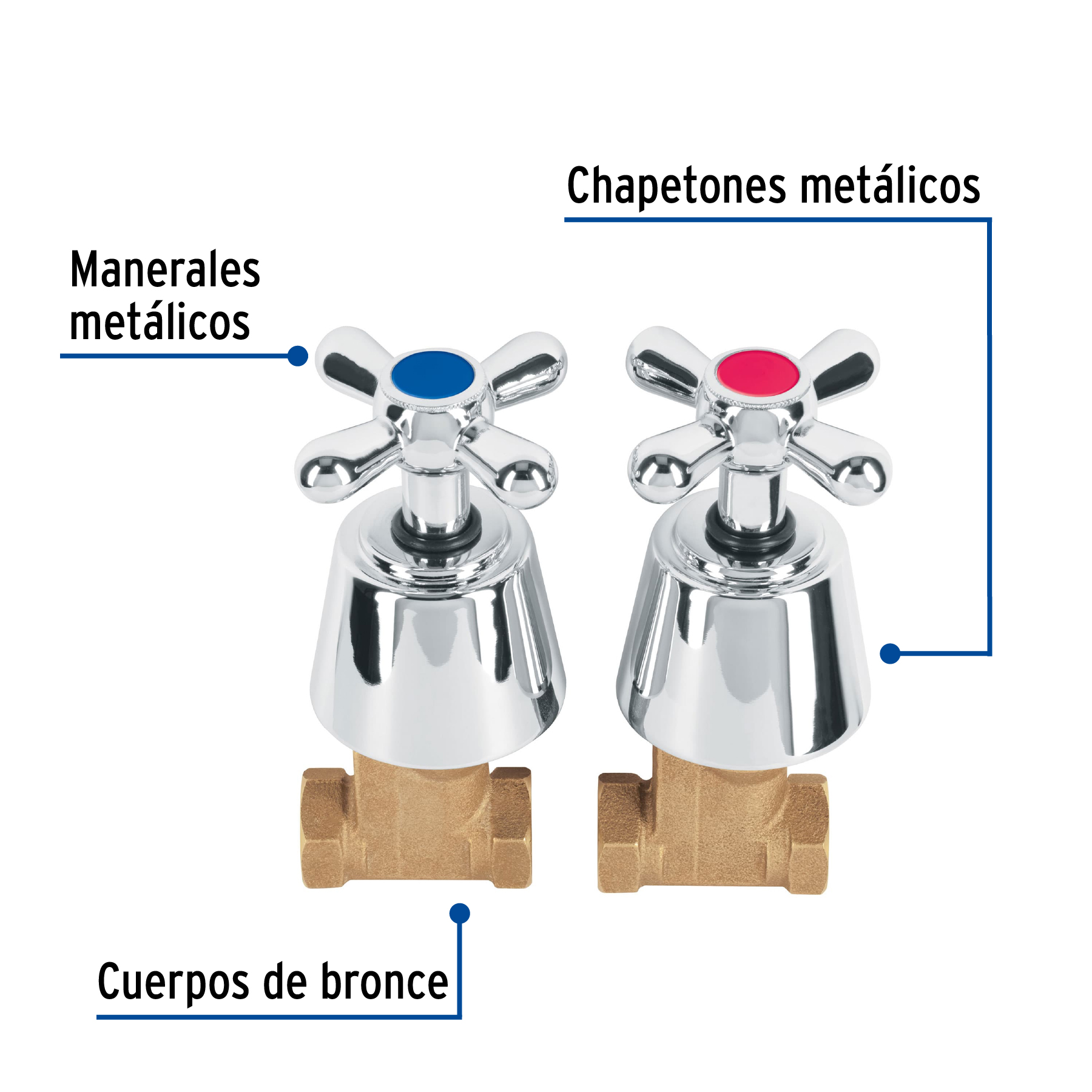 Cuerpos de bronce con 80% de cobre para máxima duración, Manerales tipo cruceta y chapetones metálicos con acabado cromo, Alta resistencia a la corrosión, Cartuchos de compresión, Conexión 1/2″