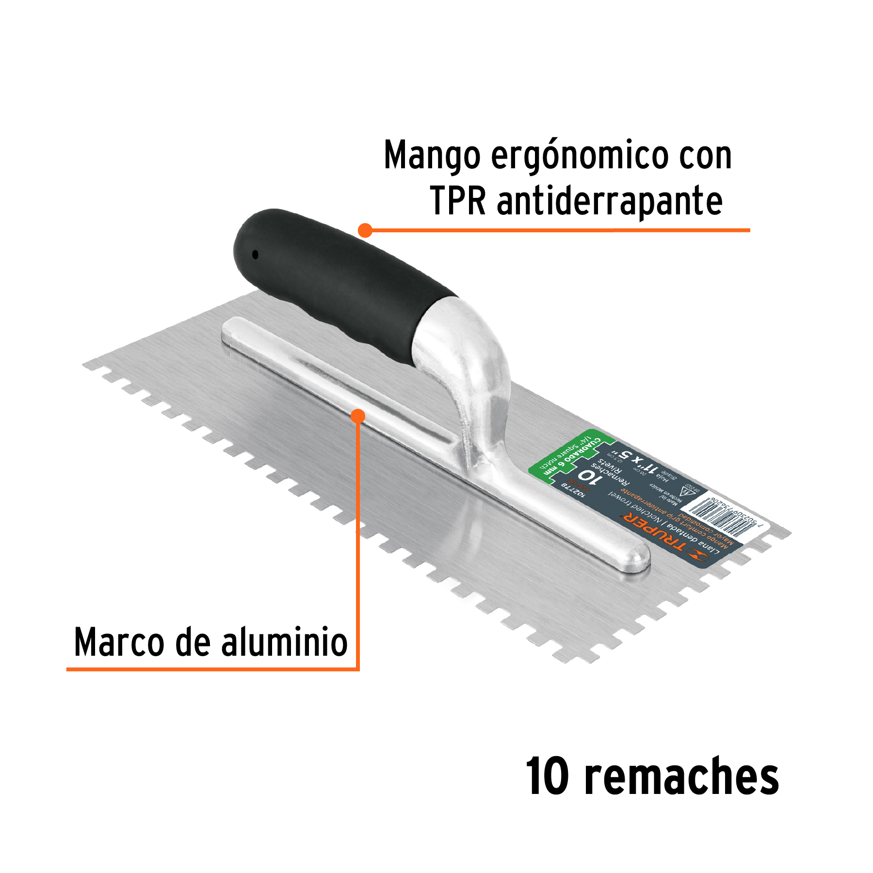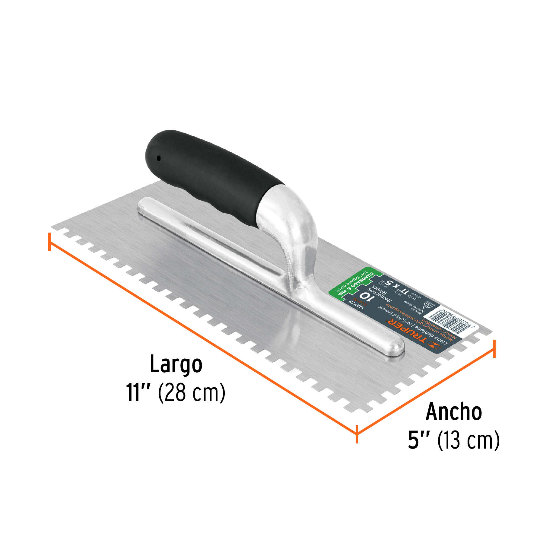 La llana dentada cuadrada de 11 pulgadas, con 1/4″ de dentado, 10 remaches y mango comfort grip, es una herramienta manual esencial para profesionales de la construcción y aficionados al bricolaje que trabajan con mezclas de cemento, mortero, yeso y otros materiales de albañilería