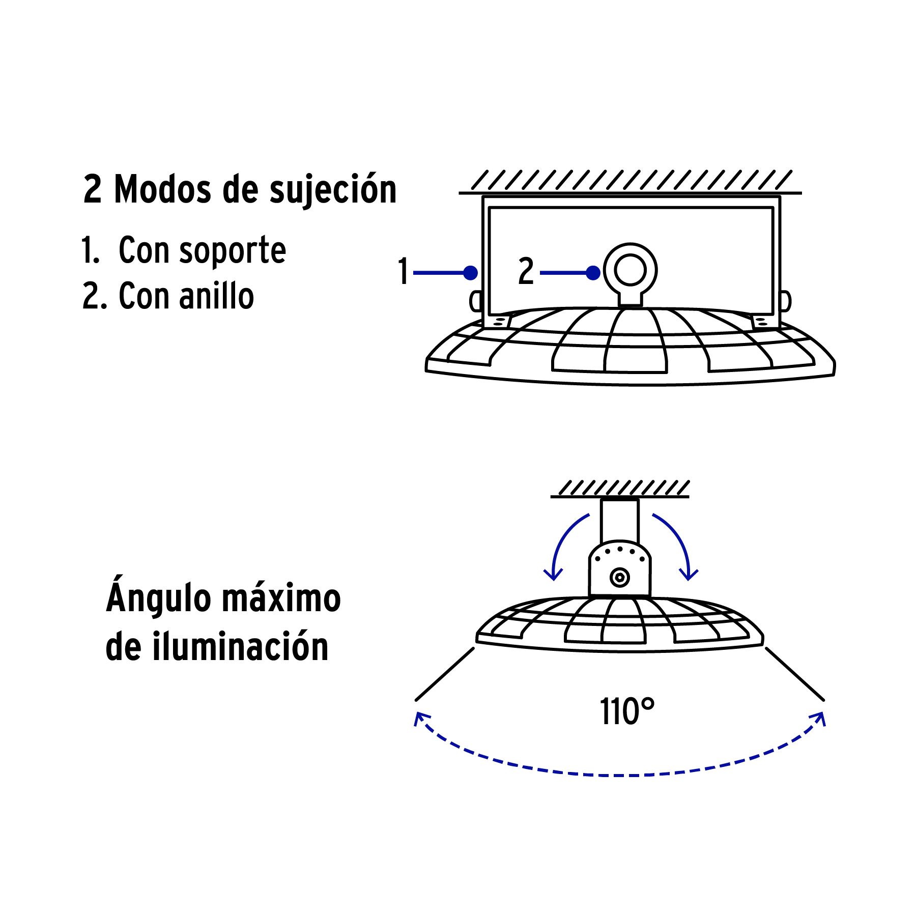 Ahorra hasta 90% en el consumo de energía, Cuerpo de aluminio y pantalla de policarbonato, Soporte ajustable para techo o pared, Gancho para colgar, Ideal para almacenes, hangares, auditorios y talleres
