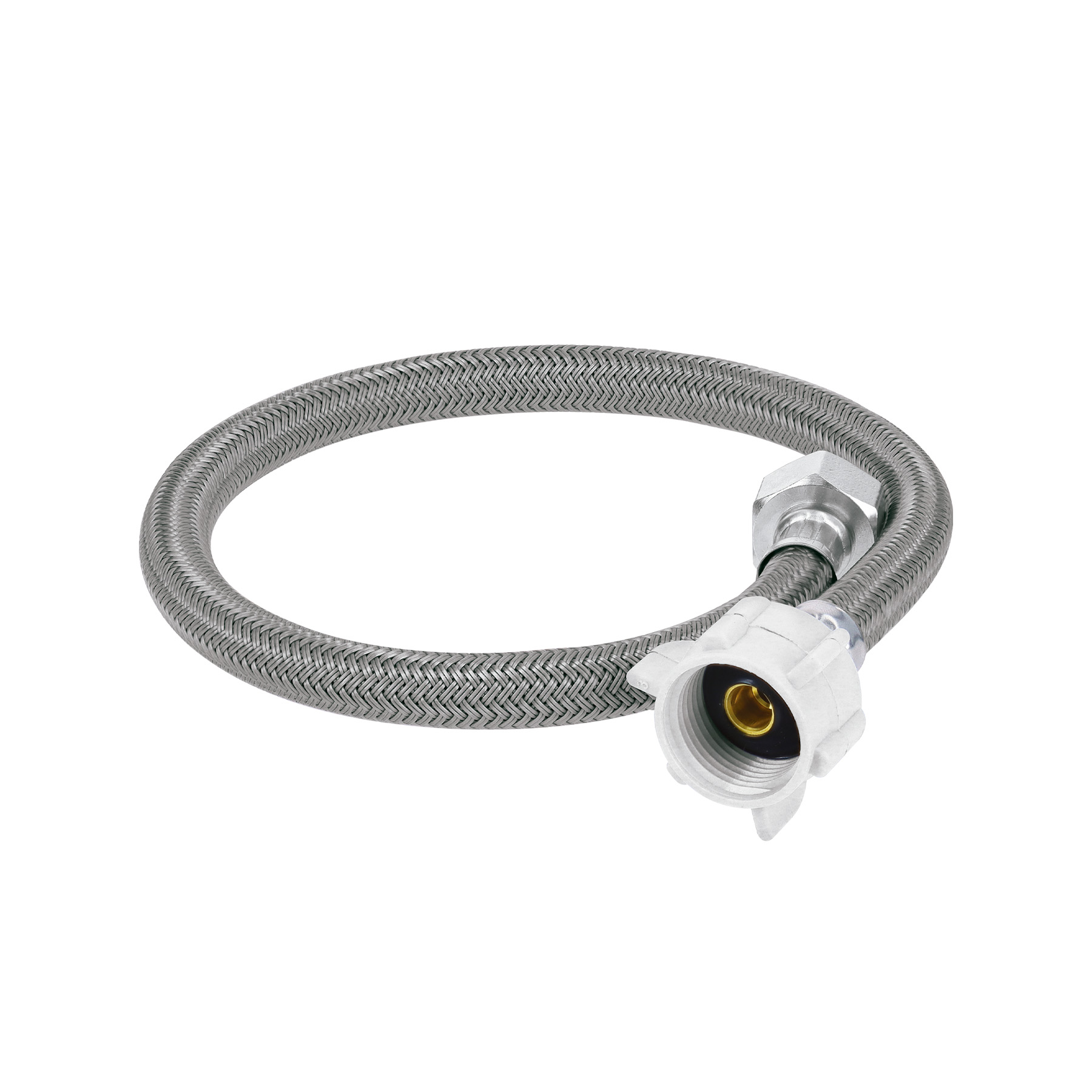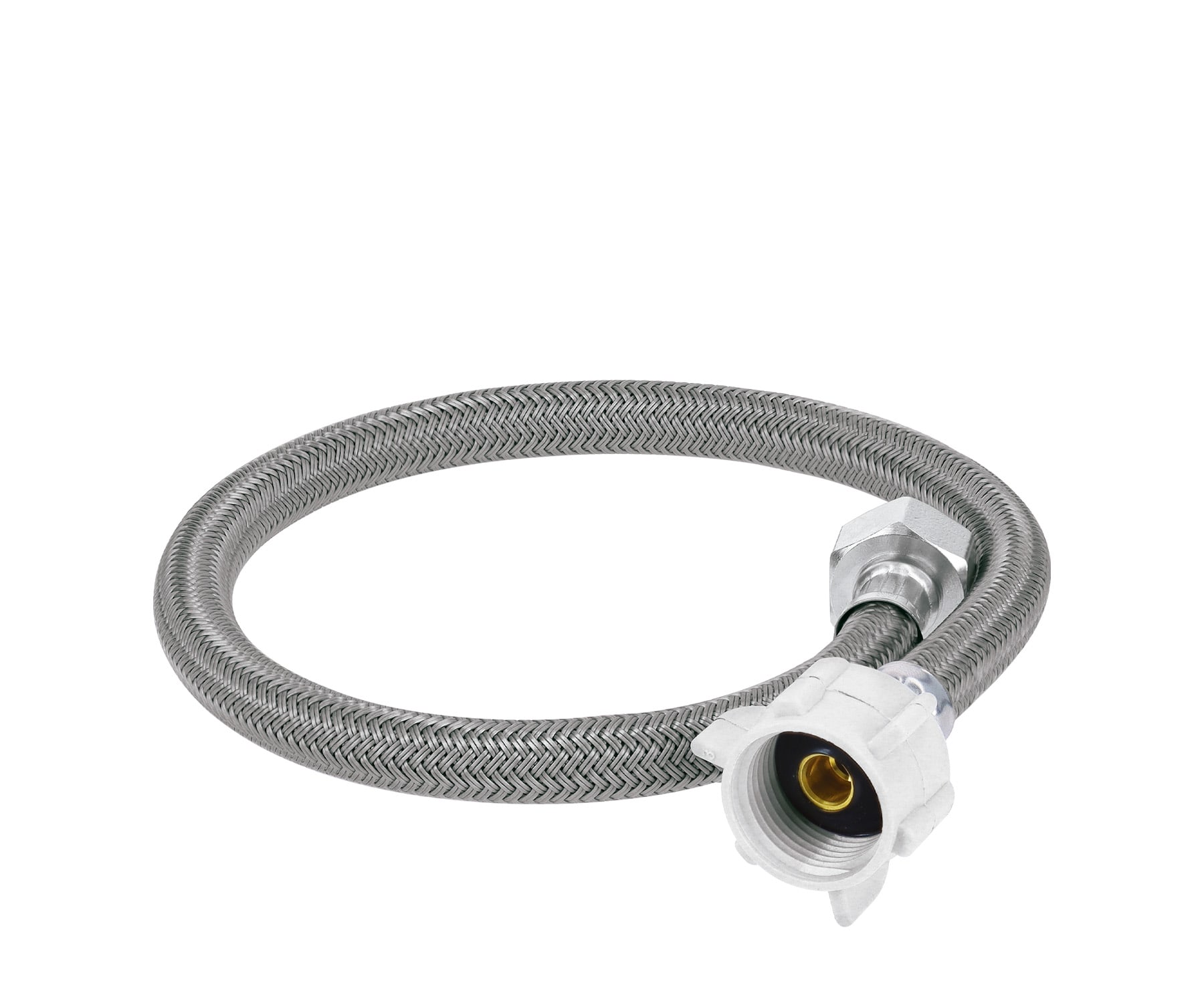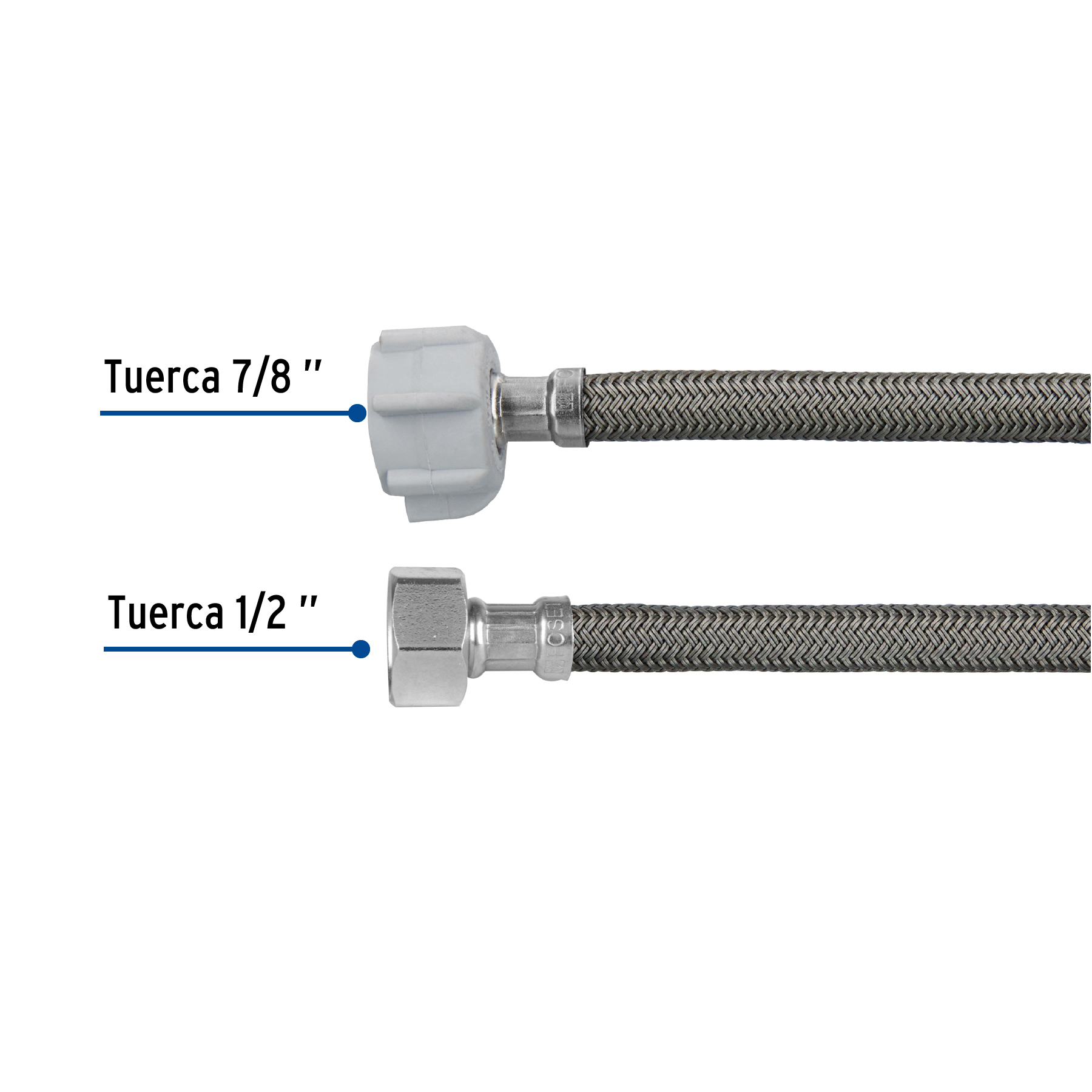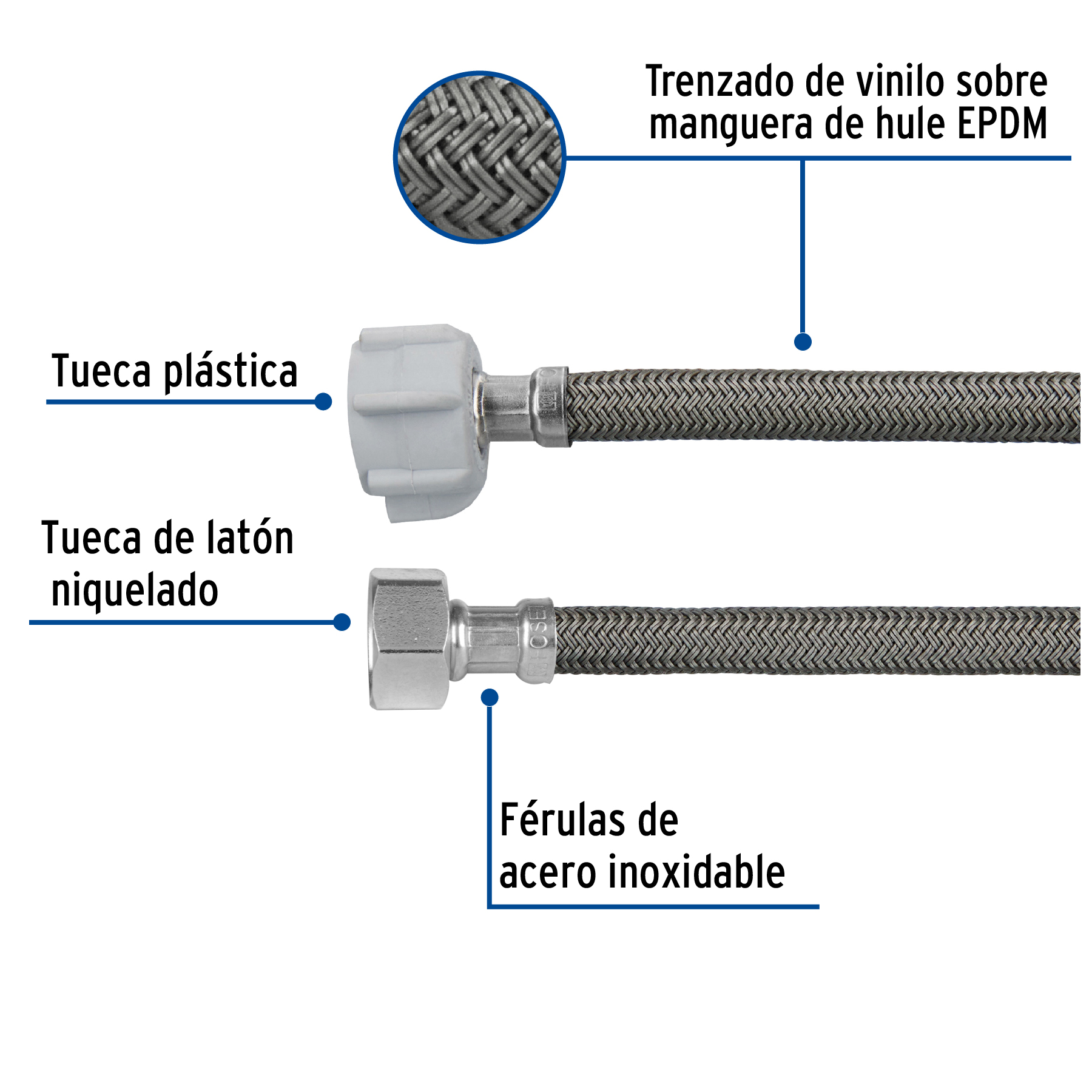 Tuerca 1/2″ de latón niquelado, Tuerca 7/8″ de plástico que permite apretar sin usar herramientas, Espigas de latón resistentes a la corrosión Trenzado con vinilo sobre manguera de EPDM para mayor flexibilidad y alta resistencia, Empaque cónico que evita fugas