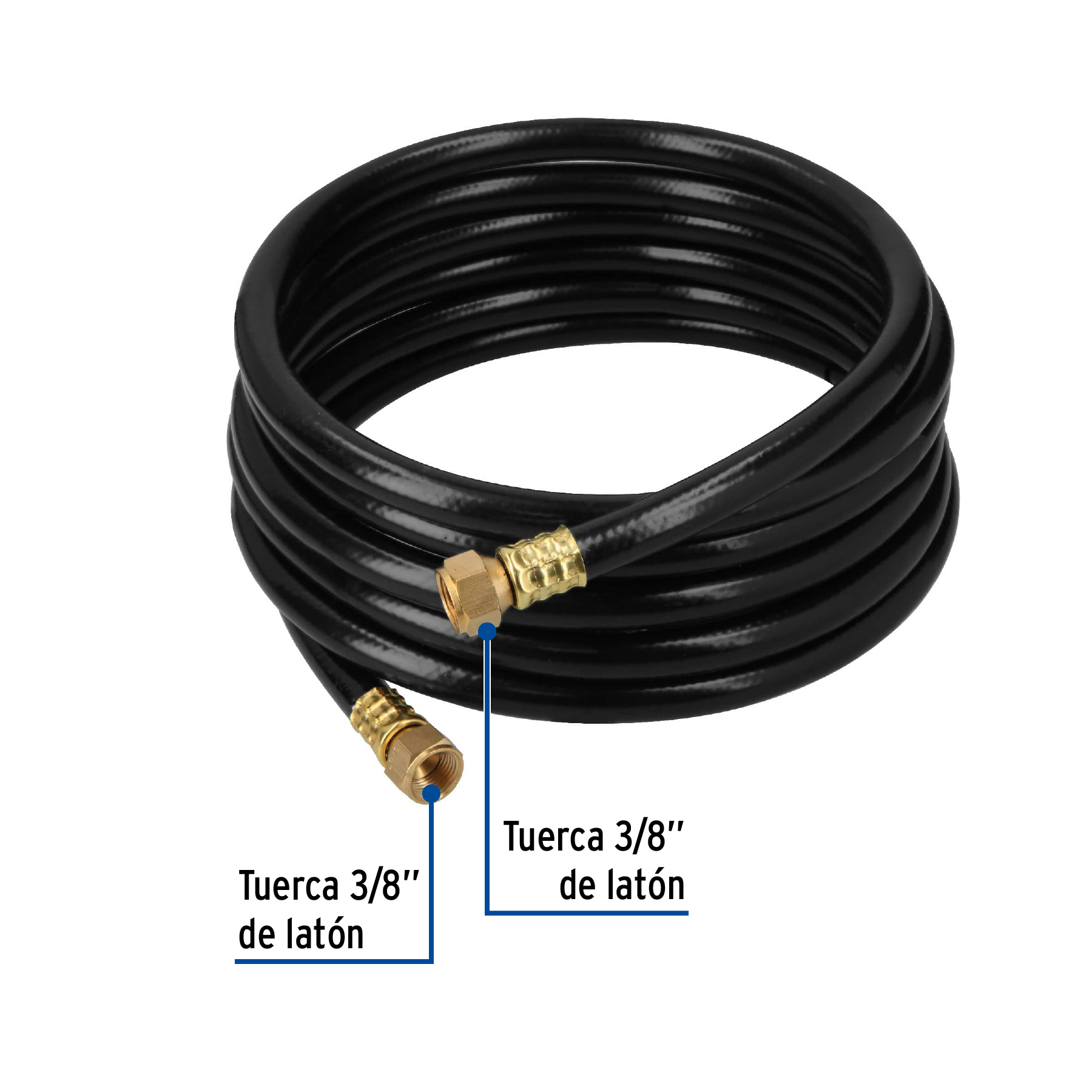 Conectores de latón de 3/8″ x 3/8″, prensados de alta resistencia, Manguera con 3 Capas fabricadas en PVC de alta resistencia con refuerzo de tramado radial, Material autoextinguible, Para manejo de gas LP o gas natural