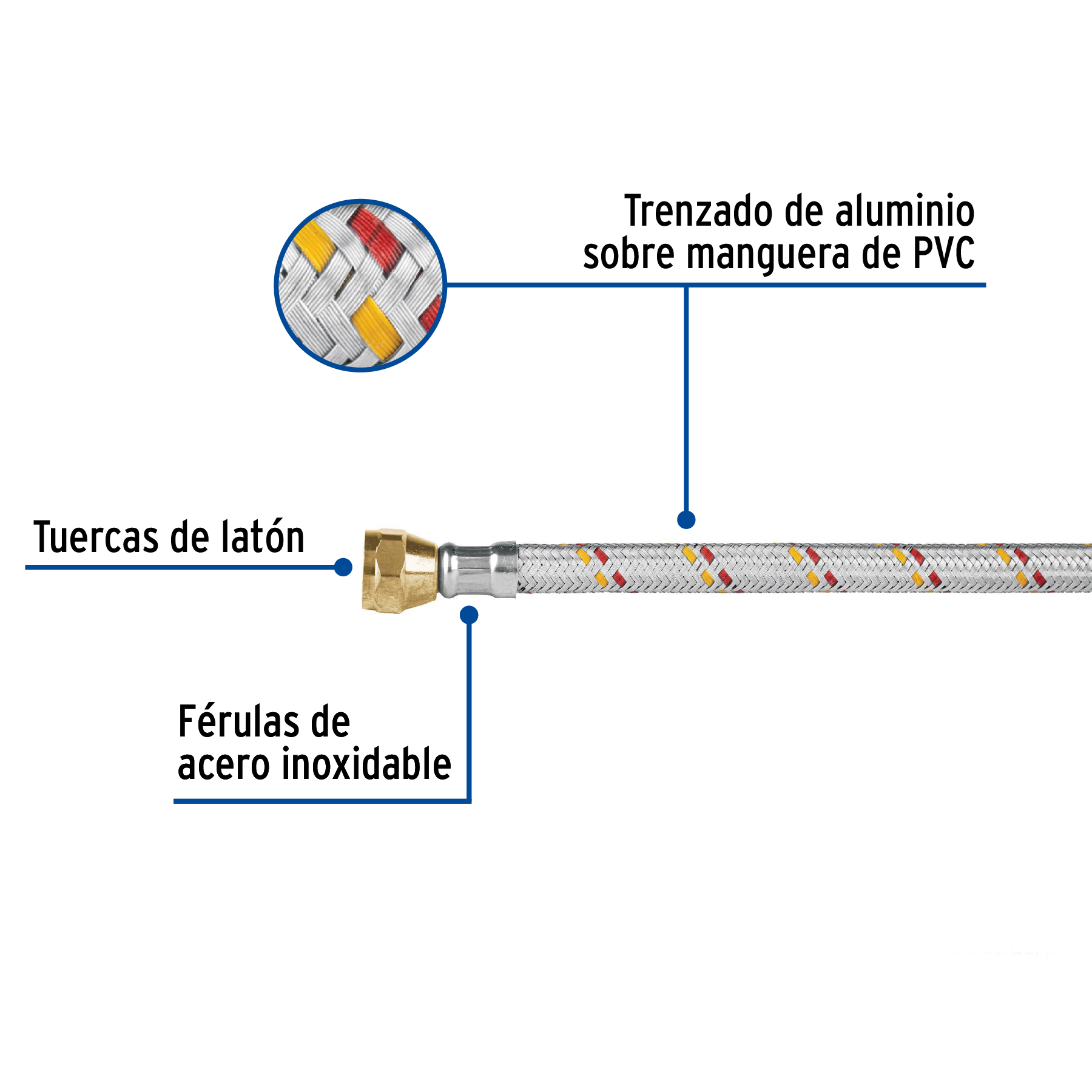 Tuercas de latón de 3/8″ x 3/8″, Tuercas de latón de 3/8″ x 3/8″, Ferulas de acero inoxidable, Trenzado de aluminio sobre manguera de PVC para mayor durabilidad y resistencia, Ideal para conectar a reguladores de gas de baja presión