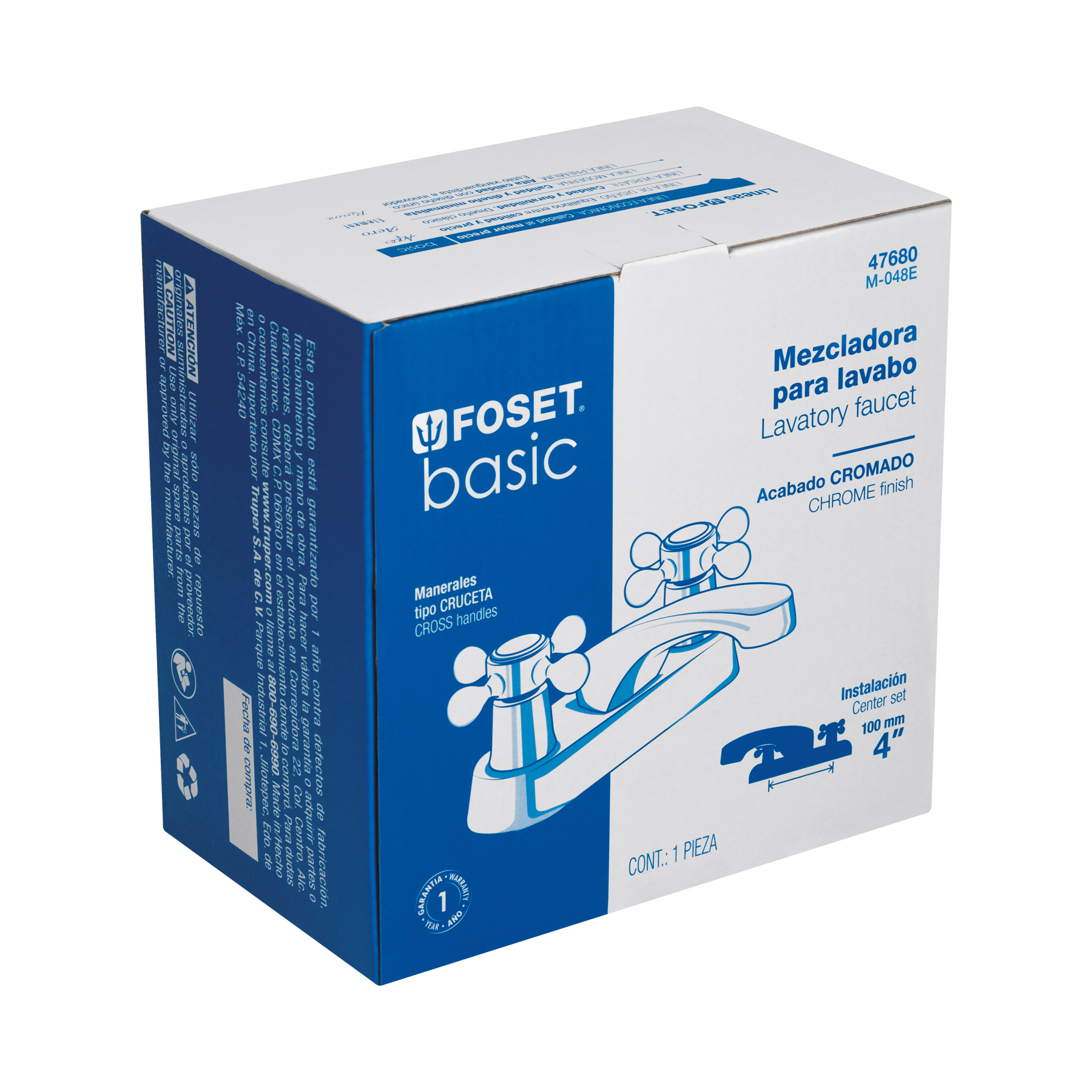 1 Mezcladora 4' para lavabo, nariz larga, manerales cruceta
