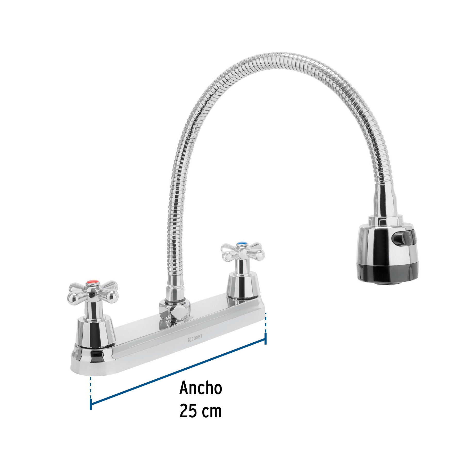 Cuerpo de latón para máxima duración, Manerales metálicos tipo cruceta, Cuello flexible de 55 cm y cubierta de acero inoxidable, Cartucho cerámico de suave y fácil apertura, Selector de chorro: Aireado y spray