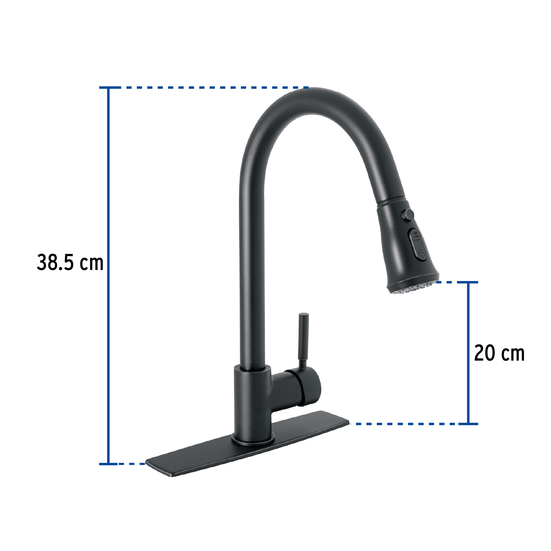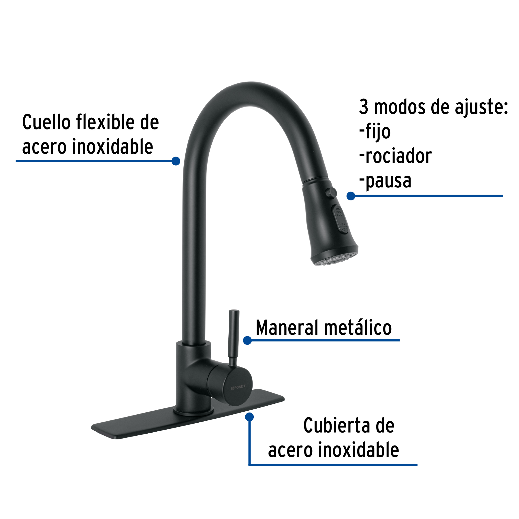 Cuerpo de latón para máxima duración, Maneral metálico, Cuello y cubierta de acero inoxidable, Cartucho cerámico de suave y fácil apertura, Selector de chorro aireado y spray