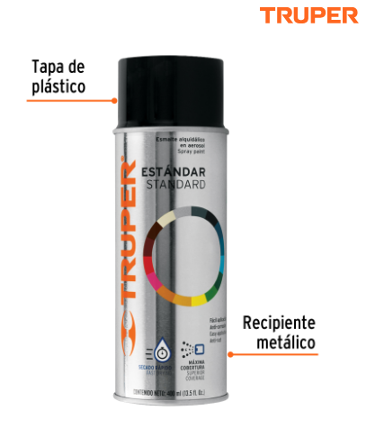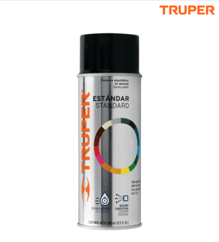 La Pintura en Aerosol Negro Mate, Bote Tradicional, 400 ml de Truper viene en un bote tradicional fácil de usar y con un sistema de válvula que proporciona un rocío uniforme y controlado. Su color negro mate es ideal para combinar con una gran variedad de estilos y decoraciones