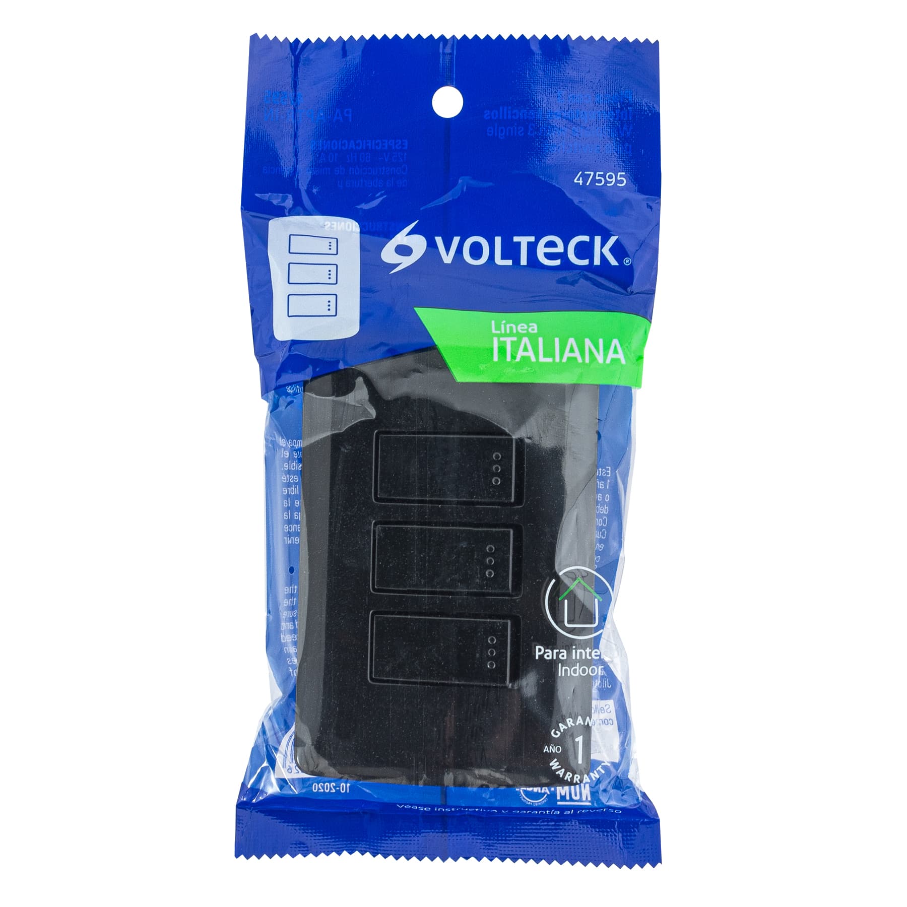 Especificación: Placa armada 3 interruptores sencillos,negro, línea Italiana