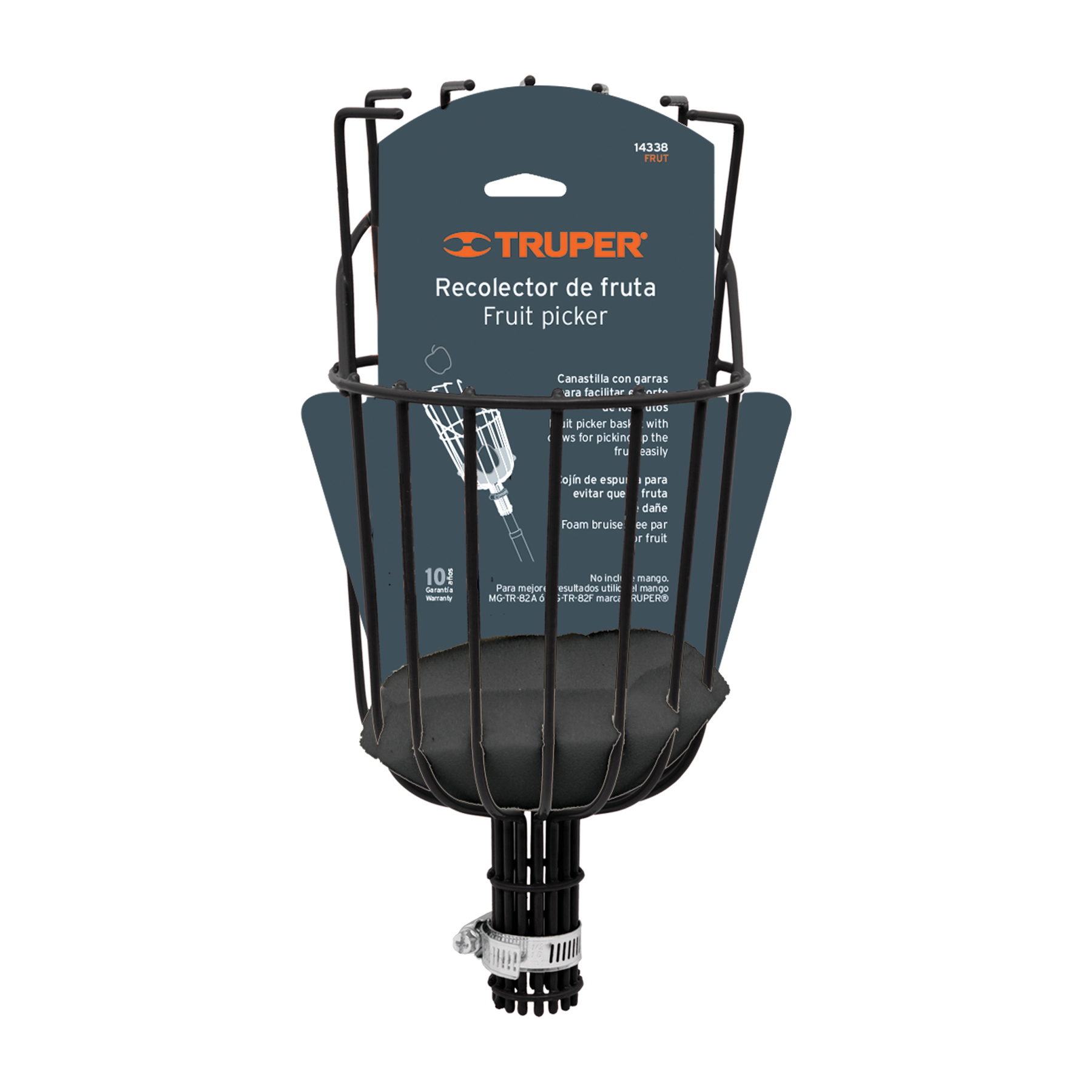 Recolector de frutas Truper, diseñado para facilitar la recolección sin dañar la fruta. Su estructura resistente y ligera permite un uso prolongado con comodidad. Compatible con mangos ajustables para alcanzar alturas mayores. Perfecto para huertos y jardines, garantizando un trabajo eficiente y seguro.